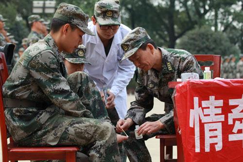 刘铁桥(右)在广州军区某通信营巡诊时为战士诊治。张智超 摄