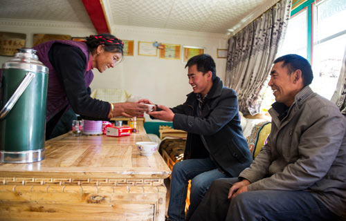 张小波(中)在村民卓嘎家中了解情况 普布扎西 摄