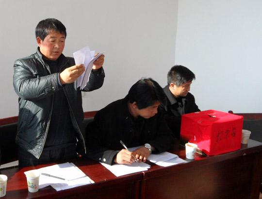 图为马维华(左)生前在尹集镇涧上村党支部换届中清点选票。