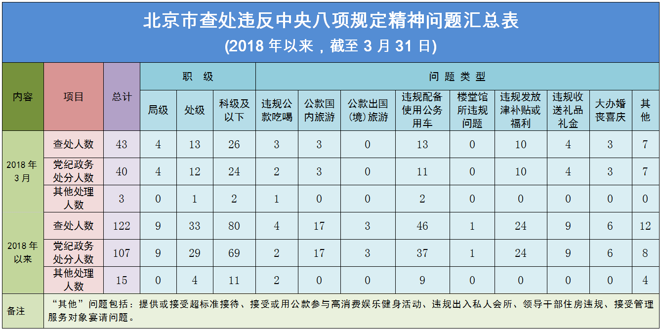 2018年3月,北京市各级纪检监察机关查处违反中央八项规定精神问题43起,给予党纪政务处分40人。