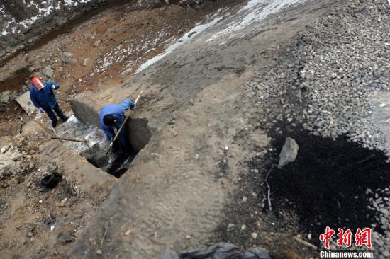 1月7日,山西长治潞城市,山西天脊煤化工集团发生苯胺泄露事故已进入第8天。在苯胺泄露的源头、中途黄牛蹄截留水库等地,天脊煤化工方面派出的工作人员正在清除污染物、投放活性炭,以降低污染物对周边环境的污染。图为天脊煤化的工作人员正在清理源头。
