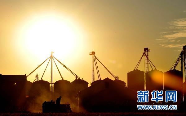 在黑龙江省八五六农场,一台收割机在粮仓前的稻田中收割水稻(2010年9月18日摄)。国家粮食局有关负责人日前表示,随着国家相继启动粮食物流建设项目、仓储建设项目、食用油库建设项目以及地方和企业加大粮库建设投入,我国粮油仓储设施条件得到根本改善,目前基本解决“卖粮难”“储粮难”问题。截至2010年底,全国共有仓储企业18326户,仓容3.9亿吨。(新华社记者 王建威 摄)