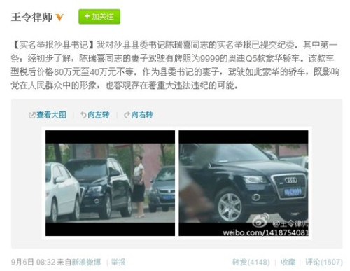 6日上午,京城律师王令在其微博中称:“对福建沙县县委书记陈瑞喜的实名举报已提交纪委,其中第一条:经初步了解,陈瑞喜同志的妻子驾驶有牌照为9999的奥迪Q5款豪华轿车,该款车型税后价格80万元至40万元不等。作为县委书记的妻子,驾驶如此豪华的轿车,既影响党在人民群众中的形象,也客观存在着重大违法违纪的可能。”在王令的微博中,还贴出了奥迪Q5汽车照片。