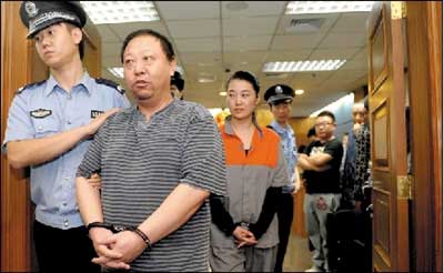 北京门头沟区原副区长闫永喜和其情妇毛旭东被带入法庭。记者 欧阳晓菲 摄