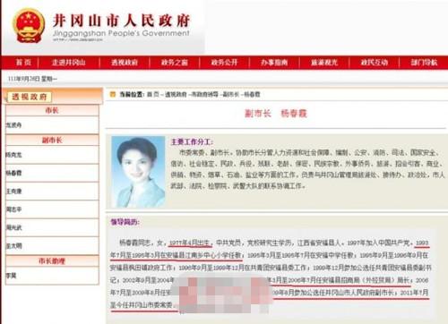 记者在吉安市人民政府网站上找到一份“吉安市公开选拔县级领导干部结果公布”的公开文件,杨春霞确实是通过公开选拔任职井冈山市副市长的。 (记者:丁建庭)