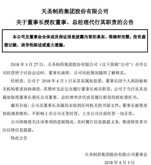 1、4月3日,天圣制药发布公告称,董事长刘群因个人原因被相关机构要求协助调查,暂时无法完全履行董事长相关职责;