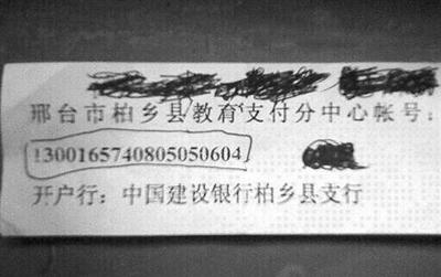 陈勇和另一名参与了该会议的人士都称,会议上县人保局干部科给每人发了一张小纸条,上面是柏乡县教育支付分中心的账户,账号为1300165740805050604,要求在20日下午之前将钱汇入账户,并把汇款凭条交到人保局干部科。