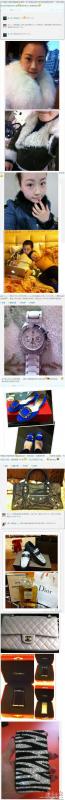 网上公布的13张图片包括1张@小Y__Y介绍“老公挂名不上班”的对话截图,12张自拍照和奢侈用品照(部分图片如左图,网络图片)。在众多的奢侈用品中,包括各式各样的名牌手表、皮包、香水、鞋子、手机、打火机,其中一款VERSACE钻石男式手表价值15万元,一款从巴黎购买的黑色女式皮包价值14900元。当日,@小Y__Y微博上有关“炫富”的内容已全部删除。