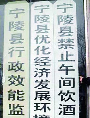 “商丘市委办公室、市政府办公室2007年4月底颁布了《关于在全市严禁工作日午间饮酒的规定》,决定于当年5月10日开始在全市严禁工作日午间饮酒。”《商丘日报》报道了这个消息,同年5月15日商丘电视台的新闻中就出现了“商丘市禁酒办”检查“禁酒令”落实情况的报道。《商丘日报》主办的《京九晚报》同年7月报道了宁陵县禁酒办查处一例工作人员违规饮酒案件,“宁陵县城市管理局给予违反规定的职工解伟行政警告处分,并免去其宁陵县城管局市政园林绿化股副股长职务。”