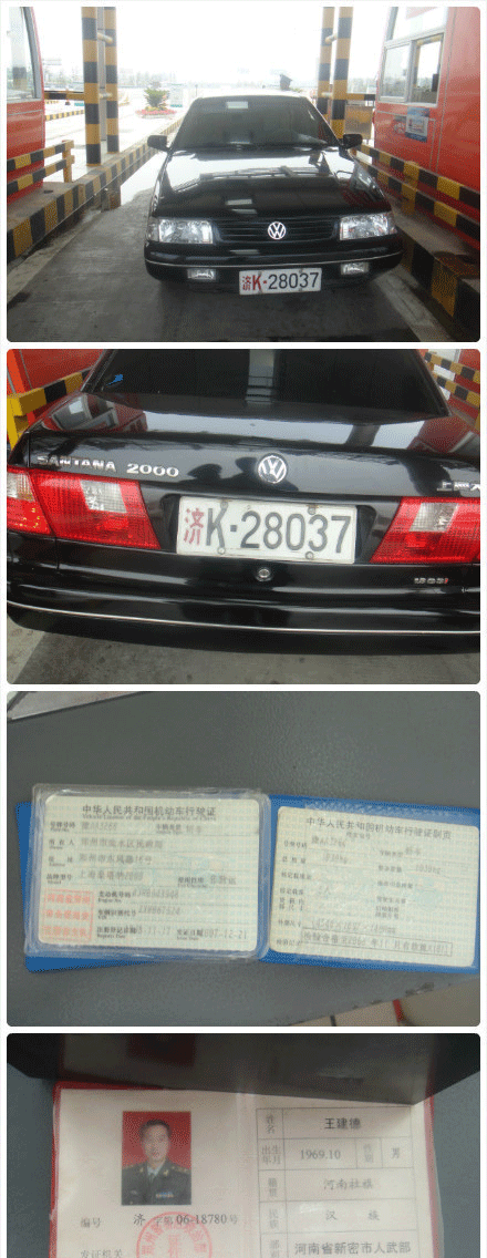 6月22日,有网友通过微博上传4张图片及131个文字,称金水区民政局挂假军牌被查,“当日14时15分,一辆桑塔纳2000轿车,悬挂济K28037军牌,从新乡上道,在郑州新区站下道时被查,此车车牌为豫AA3266,车辆所有人为郑州市金水区民政局。司机是新密市武装部副部长,根据《河南省人民政府关于加强公路通行费收费管理工作的通告》的相关规定对此车加收5倍通行费。”
