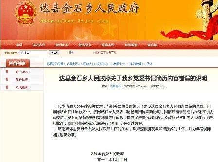 四川达县金石乡政府随后就此事在官网发布消息对此进行说明。说明中提到,应政务公开建设的要求,该乡与相关网络公司签订了建设达县金石乡人民政府网站的合同。目前网站正在试运行之中。该网站在录入党委书记杨明国简历时,因信息编辑完成后没有进行认真校对,发布前没有按照相关制度进行审核,造成了严重信息错误。乡政府已对相关人员进行了严厉批评,同时对相关错误信息进行了纠正,并引以为鉴。