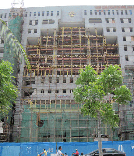 处于停工状态的三亚中院办公楼,中间部分即是加装的钢结构。(资料图)
