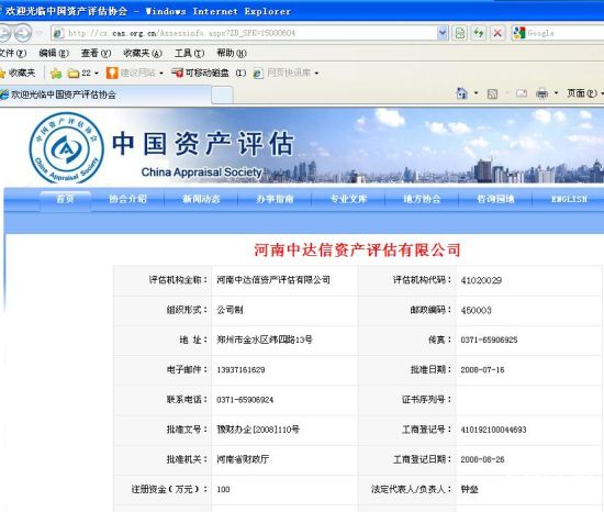 记者调查发现,河南中达信资产评估有限公司法人代表、评估师钟某,办公地址在郑州市纬四路13号。注册评估师钟某,执业在河南拍卖行有限公司,办公地址也在同一地点。7月15日上午,网络新闻联播记者来到郑州市纬四路13号,发现两家公司确在一栋大楼上,但中达信资产评估公司依然无人接受采访。
