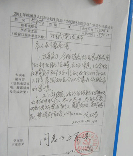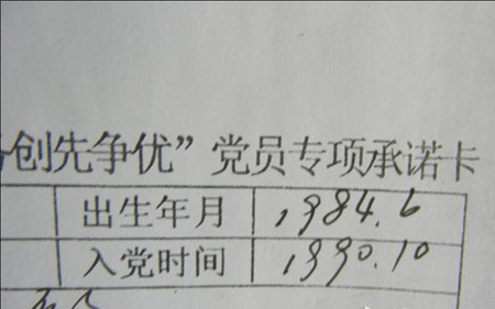 “看看这位姓龙的公务员,84年出生,90年也就是6岁入党,这样的水平,这样的公务员,令我实在是佩服。”7月25日上午,一条题为《芳龄28党龄22年我被桃源计生局最牛公务员雷到了!!!》的帖子被发到红网论坛常德版,发帖人“大国良民”上传的图片显示,桃源县人口与计划生育局一位龙姓公务员的“2011年为民服务创先争优党员专项承诺卡”里,出生日期填写的是1984年6月,而入党时间是1990年10月。