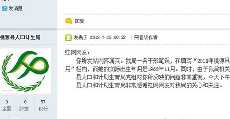 帖子在红网论坛发出4个小时后,用户名为“桃源县人口与计划生育局”的网友跟帖回复。跟帖承认网友所发图片内容属实,系该局一名干部笔误,“把自己‘参加工作时间’填在了‘出生年月’栏内,而她的实际出生年月是1963年11月”。
