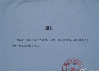 8月6日,微博账号“老船大师傅”晒出一张“最实在通知”的图片并“求辟谣”,内容是7月27日发布、落款为凤凰县工商行政管理局沱江工商所并加盖公章的一则通知:“因我所干部职工家中办喜酒,全体干部前往做客,请办事的人员星期一再来办理相关业务”。