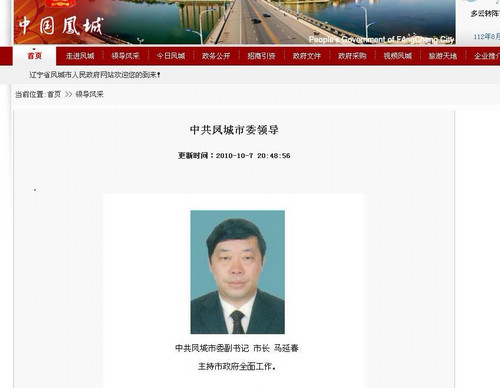 记者检索辽宁省凤城市人民政府网站,发现“领导风采”的“中共凤城市委领导”栏中没有市委书记的信息,最上一栏为市委副书记、市长马延春的照片。