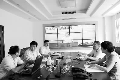 武汉市检察院反渎局领导在指挥室边看讯问过程,边研究对策。