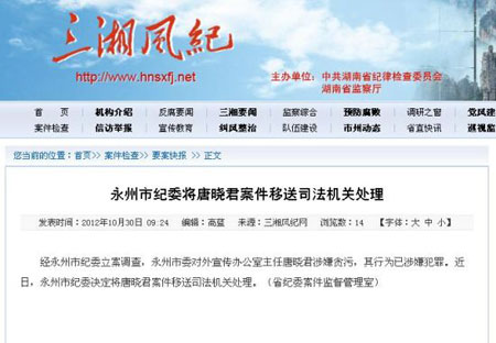 经永州市纪委立案调查,永州市委对外宣传办公室主任唐晓君涉嫌贪污,其行为已涉嫌犯罪。近日,永州市纪委决定将唐晓君案件移送司法机关处理。(湖南省纪委案件监督管理室)