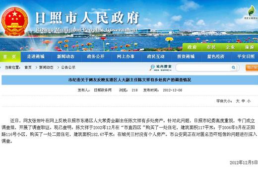 近日,网友张世叶在网上反映日照市东港区人大常委会副主任陈文祥有多处房产。针对此问题,日照市纪委高度重视,专门成立调查组,开展了调查取证。现已查明:陈文祥于2002年12月在“市直四区”购买了一处住宅,建筑面积117平米;于2006年9月在正阳路116号小区,购买了一处二层住宅,建筑面积182.67平米;在城关三村没有个人房产。市公安局正在对匿名恐吓短信的问题进行深入调查。