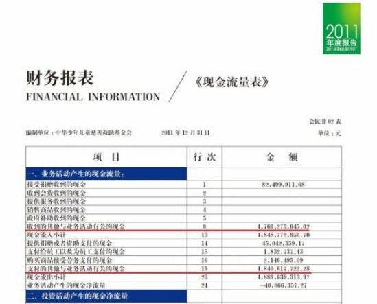 儿慈会表示,财务人员将一笔数额为4.75亿元的“银行短期理财累计发生额”误写为47.5亿元,致使2011年度基金会《现金流量表》中的“收到的其他与业务活动有关的现金”达到年报上刊出的错误数字,这是基金会工作人员和领导审核的严重失误。