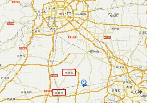 河北省廊坊市的霸州市和永清县离北京市和天津市均不远,距离六七十公里左右。图片蓝色标注点为永清县黄家堡村的地理位置。图片来源:SOSO地图