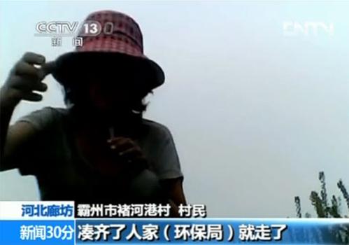 当地的村民在接受采访时说:“上面命令要50万,这些厂子就得凑齐了,凑齐了人家(环保局)就走了”。(图片来源:央视新闻)