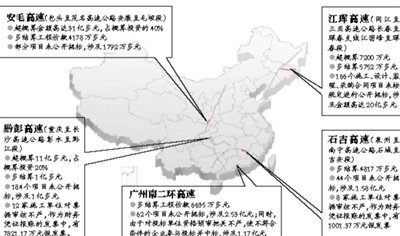 昨日,审计署发布了包头至茂名高速公路安康至毛坝段(安毛高速)、同江至三亚高速公路广州绕城公路南段(广州南二环高速)、同江至三亚高速公路长春至珲春支线江密峰至珲春段(江珲高速)、重庆至长沙高速公路彭水至黔江段(黔彭高速)、泉州至南宁高速公路石城至吉安段(石吉高速)等5条高速公路的财务审计结果。