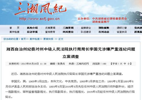 中国共产党新闻网北京5月30日电 (李源)据湖南省纪委主办的“三湘风纪”网消息,近日,湘西自治州纪委对州中级人民法院执行局局长李国元涉嫌严重违纪问题立案调查。