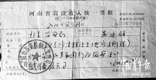 自2010年1月5日被取保候审后,吴运强表示,自己曾多次向陈红霞索要保证金正规收据,直到10个月后,才收到一张《河南省罚没收入统一票据》,上面显示:收款单位为“纪委、监察局”,违法(章)事项是“违纪款(非法转让土地非法所得)”,处罚依据是《中华人民共和国行政监察法》,公章为“固始县非税收入管理局财务专用章”,开具日期是2010年11月23日。