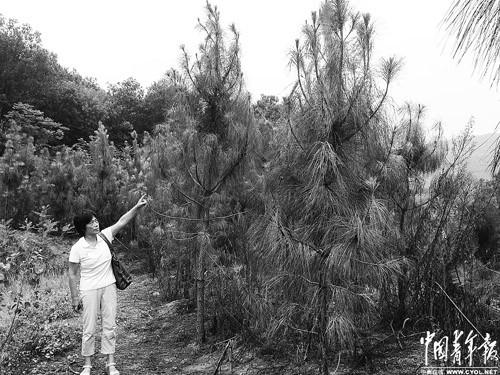 7月13日,钟祥市大生化工有限公司发生气体泄漏,村民姚成英屋后的376棵松树被散发出来的浓烟熏红。记者 李林摄