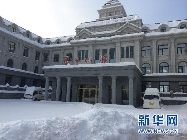 12月9日,记者在镜泊湖公园内找到了这家著名的山庄。虽然面积比穗丰园小得多,但外墙用大理石装潢的四层主楼在雪中别有一番雅致的风味。透过紧锁的门窗,记者看到大厅内有沙发、茶几,一盏华丽的吊灯悬挂在天花板之上,再配以背墙上金黄色的花纹和走廊的金黄立柱,确有一种金碧辉煌的感觉。