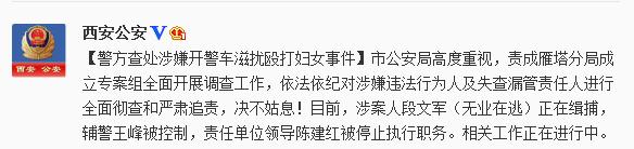 据陕西省西安市公安局官方微博消息,针对媒体报道疑似西安辅警酒后调戏殴打女子后开警车离去一事,西安市公安局今日发布消息称,警方高度重视,责成雁塔分局成立专案组全面开展调查工作,依法依纪对涉嫌违法行为人及失查漏管责任人进行全面彻查和严肃追责,决不姑息。