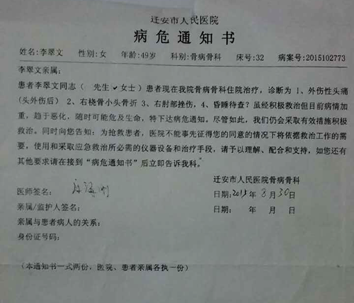 与此同时,邓建辉从派出所回到医院,也闯进了患者病房,同姐姐邓建英连续几次干扰医生抢救患者。救治医生报警后,才制止了二人的嚣张气焰。此时,患者李翠文被送ICU病房,并被下达了病危通知书。