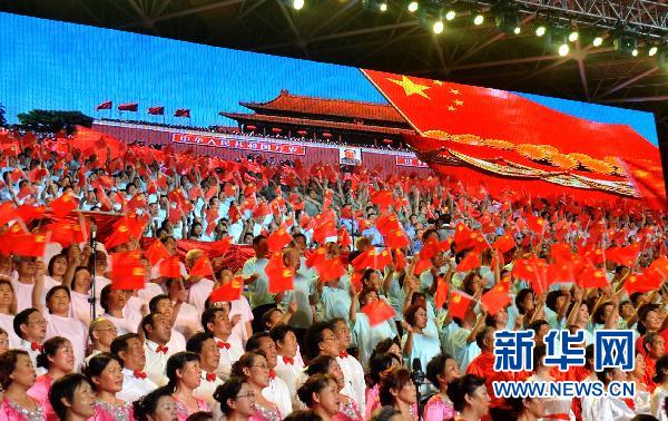 6月21日,在北京石景山区“庆祝建党90周年红歌会”上,千余名军民共同高唱《没有共产党就没有新中国》。当日,“颂歌献给党”石景山区庆祝中国共产党成立90周年红歌会在北京市石景山体育馆举行,来自驻区机关、部队、院校、社区居民等数千人参加了红歌演唱活动。红歌会分为三个篇章,以舞蹈、独唱、小合唱、大合唱等多种形式,歌颂中国共产党90周年的光辉历程。新华社发(李文明 摄)
