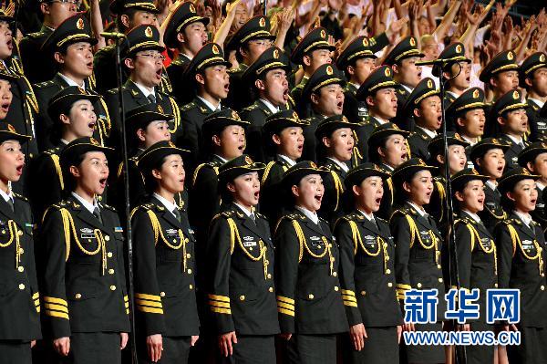 6月21日,在北京石景山区“庆祝建党90周年红歌会”上,北京军区政治部战友文工团合唱队高唱《中国人民志愿军军歌》。当日,“颂歌献给党”石景山区庆祝中国共产党成立90周年红歌会在北京市石景山体育馆举行,来自驻区机关、部队、院校、社区居民等数千人参加了红歌演唱活动。红歌会分为三个篇章,以舞蹈、独唱、小合唱、大合唱等多种形式,歌颂中国共产党90周年的光辉历程。新华社发(李文明 摄)