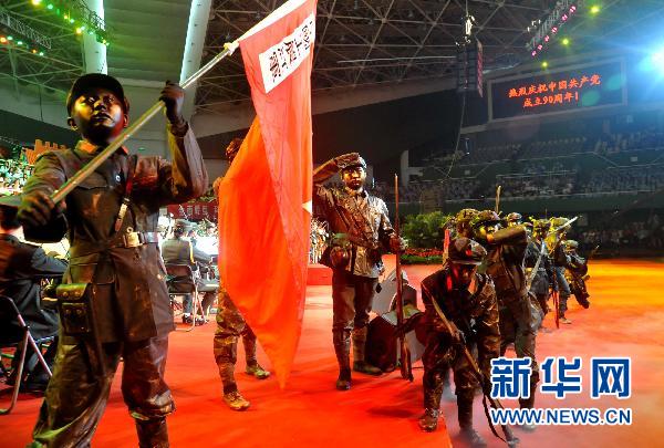 6月21日,在北京石景山区“庆祝建党90周年红歌会”上,演员们表演红军过雪山草地的片段。当日,“颂歌献给党”石景山区庆祝中国共产党成立90周年红歌会在北京市石景山体育馆举行,来自驻区机关、部队、院校、社区居民等数千人参加了红歌演唱活动。红歌会分为三个篇章,以舞蹈、独唱、小合唱、大合唱等多种形式,歌颂中国共产党90周年的光辉历程。新华社发(李文明 摄)