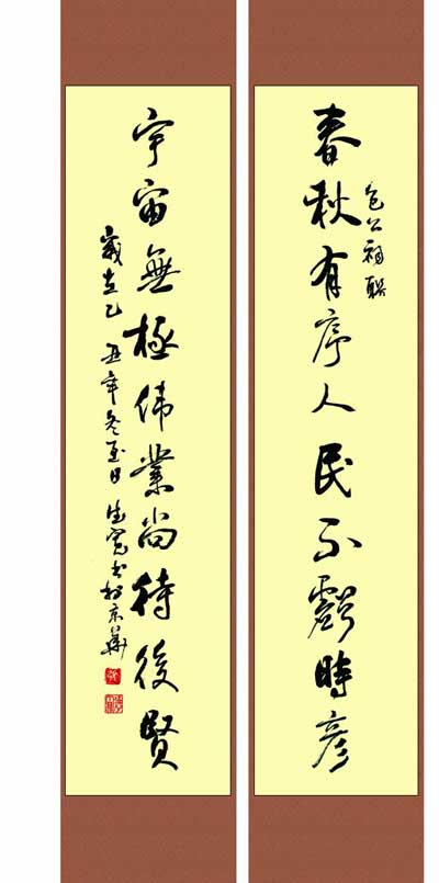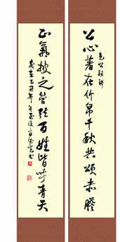 楹联,俗称“对联”、  “对子”,又名“联语”。 春节的头等大事之一是写春联,自古如此。春联起源于周代的桃符(悬挂在大门两旁的长方形桃木板),《后汉书•礼仪志》说:“正月一日,造桃符着户,名仙木,百鬼所畏。”汉字刻在桃符上就像面具、图腾,它本身就是神灵的象征。楹联言简意深,两两相对,对仗工整,平仄合韵,是一字一音的汉语言独特的艺术形式,是中华民族具有强烈地域风格的文化,具有独立的文学地位。上联与下联要对仗。对仗有顺对,有反对,有嵌字对,有叠字对,有顶针对,有宽字对,可长可短。如四字、六字、七字、十多字,长的也可写两行的龙门对。