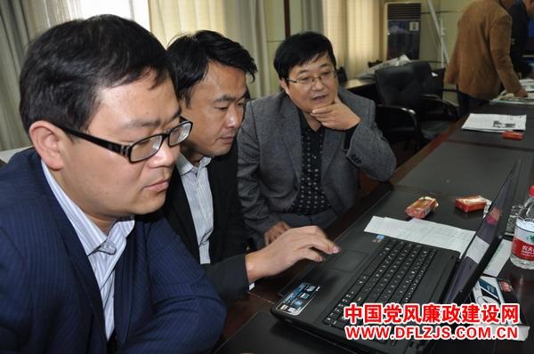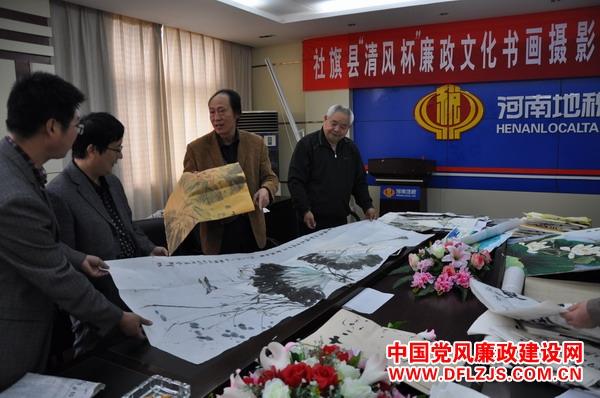 10月27日,河南省南阳市社旗“清风杯”廉政文化书画摄影作品评奖仪式在县地税局举行。图为社旗县纪委有关领导及县书法、美术、摄影协会的评委正在对参赛作品进行评审。