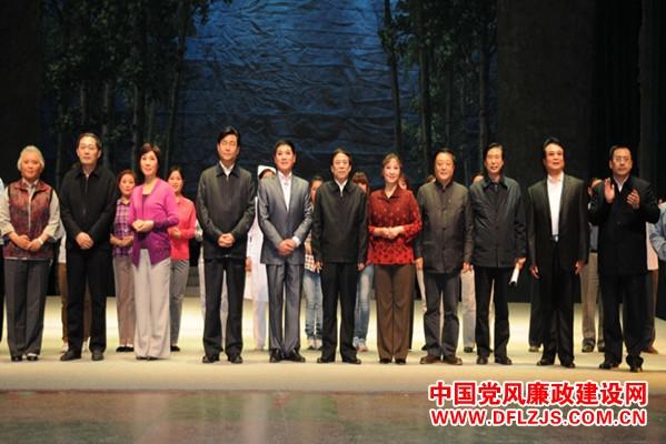 11月12日晚,河南省周口人民会堂内座无虚席,反腐倡廉豫剧现代戏《天职》正在演出。中央纪委宣教室主任杨小平,河南省纪委副书记李建社,周口市政府市长岳文海,中央纪委宣教室副局级纪律检查员、监察专员陈宏滔,河南省纪委常委、监察厅副厅长付静,河南省纪委宣教室主任于善法,周口市委常委、市纪委书记杨正超,周口市委常委、组织部长李明方,周口市政府副市长刘国连,以及出席领导干部谈心提醒和关爱教育工作联系点座谈会的代表一同观看演出。