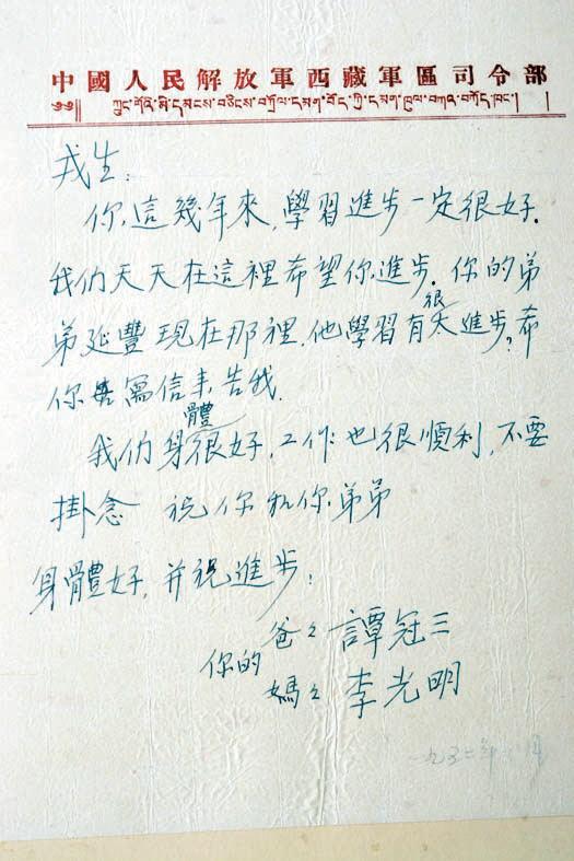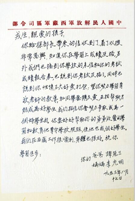 父母连续在西藏工作长达12年。对孩子们的教育和关爱全靠家书传递。从1952年到1964年,父母给谭戎生写了约50封家书。这期间,进藏部队要生存立足,时任西藏军区政治委员的父亲带头开荒生产,紧接着是平息少数反动势力分裂西藏的叛乱和被迫进行边境自卫反击作战……从父亲的来信就能看出他们的繁忙来。那些信并不都是写在正规的信笺上的,有的就写在一张便笺上或从笔记本上撕下的一页纸上,可见是百忙中抓住一点空暇急就成书的。短笺上凝聚着夫妻俩对儿女们立身做人、品德人格包括怎么学好语文、怎么与同学搞好团结等方方面面的教导,信末总是写上“祝你们进步”,爱子之心,跃然纸上。从西藏到北京的邮路常常中断,家书对他们的儿女来说,弥足珍贵。谭戎生一直珍藏着这些家书,像珍藏一份丰厚的家产。