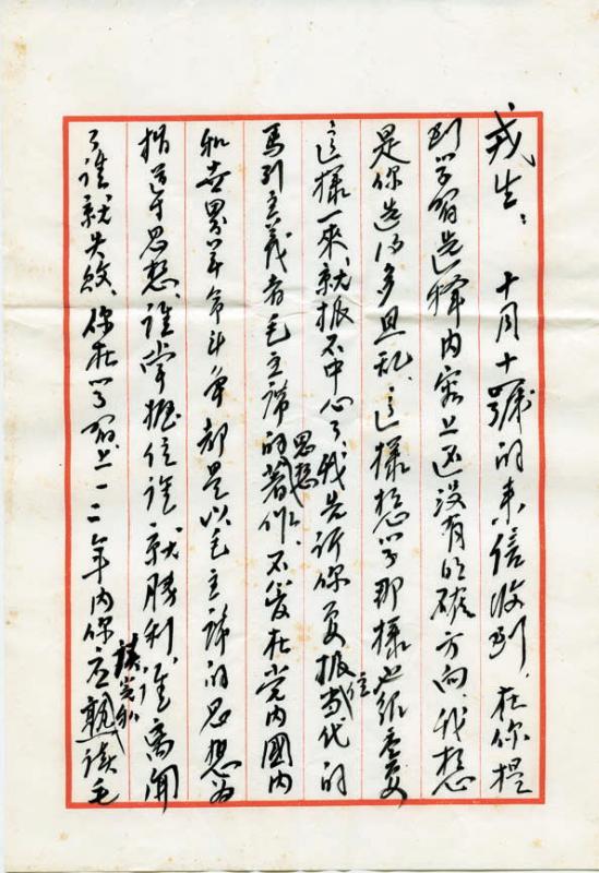 戎生:你这几年来,学习进步一定很好。我们天天在这里希望你进步。你的弟弟延丰现在哪里?他学习有很大进步?希望你写信来告诉我们。我们身体很好,工作也很顺利,不要挂念。祝你和你弟弟身体好,并祝进步!