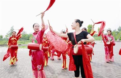 为农村聘请编舞师是河南省焦作市武陟县在美丽乡村建设中,实施丰富农村群众文化生活,提升基层软实力“文化工程”的一个缩影。今年以来,当地党委政府在全县农村开展了以文化、平安、慈善等为主要内容的“六大工程”建设,进一步夯实农村基层发展的经济、社会和文化基础。图为6月28日,在该县覃怀公园,舞蹈教师张敏(前右)在指导队员编排腰鼓舞。新华社发