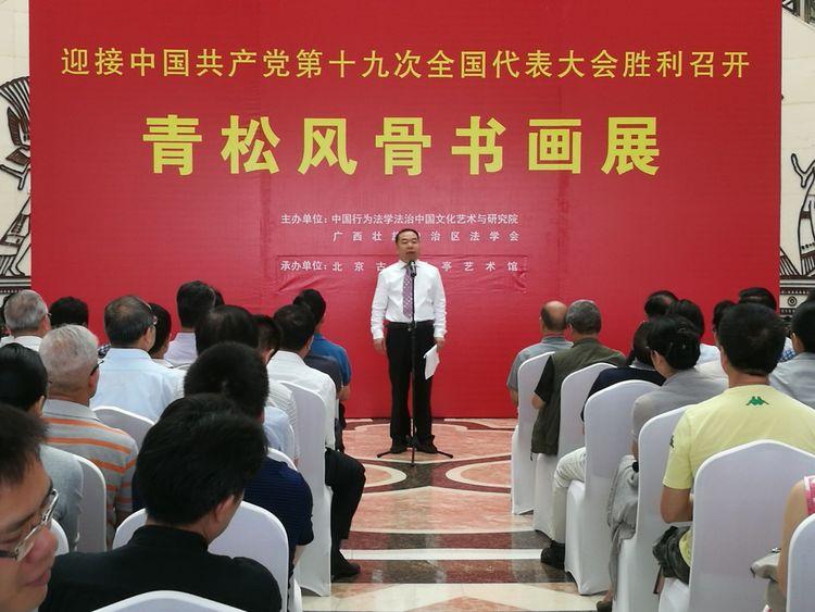 为迎接党的十九大胜利召开,弘扬中国优秀传统文化,由中国行为法学会法治中国文化艺术研究院和广西壮族自治区法学会共同主办的“青松风骨书画展”5月7日在广西南宁隆重举行开幕仪式。最高人民法院党组副书记、副院长,中国行为法学会会长江必新;国务院三峡办原党组成员、中国行为法学会法治中国文化艺术研究院院长张宝欣;广西自治区党委原书记陈辉光;自治区党委原副书记潘琦;自治区党委常委、宣传部长范晓莉;自治区政协党组副书记、副主席温卡华;全国人大常委会委员、全国人大民族委员会委员梁胜利;自治区高级人民法院原党组书记、院长罗殿龙;自治区高级人民法院党组书记、院长黄克;南宁海关党组书记、关长李文健;自治区党委政法委副书记李伟文;自治区文化厅党组书记、厅长黄宇;自治区法学会党组书记、常务副会长李沛芬等出席了开幕仪式。