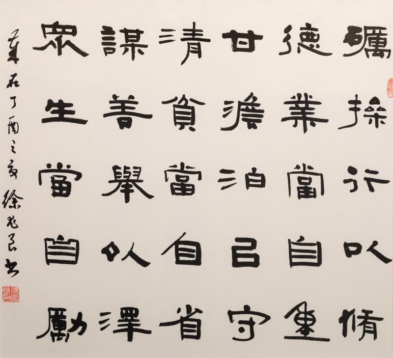 隶书 释文:砺操行以修德业,当自重;甘淡泊以守清贫,当自省;谋善举以泽众生,当自励。 徐优良书