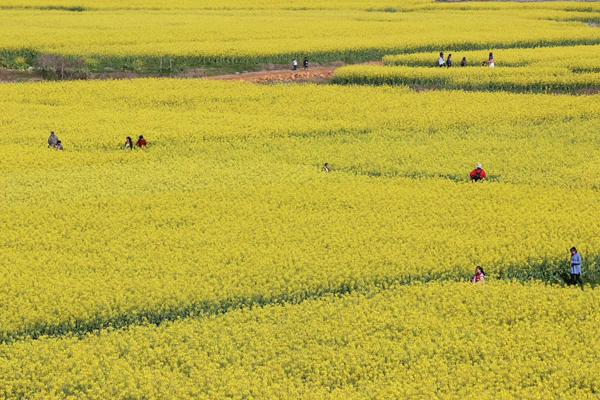 万亩油菜织金带。在通城县塘湖镇黄袍山,万亩油菜花竞相绽放,引得游客纷至踏来,红色老区“赏花经济”惠百姓、促民生。