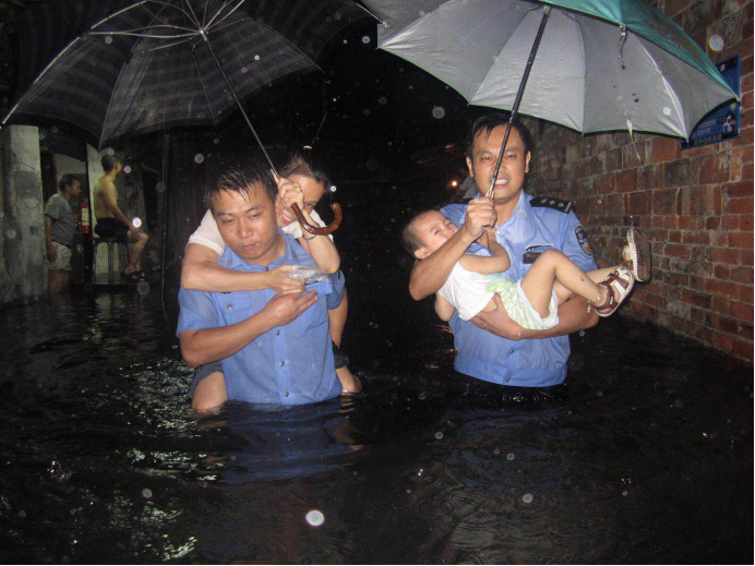 暴雨中,江西省南昌市西湖分局筷子巷派出所党员民警不顾个人安危,连夜迅速转移被困老人和小孩。