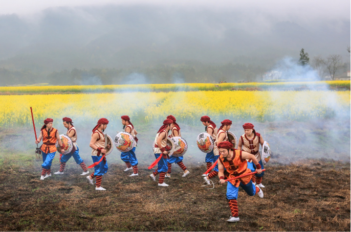 “不练盾牌舞,不是男子汉。”赣西南山区,农人们在田野中表演永新盾牌舞。铿锵步伐、粗犷舞姿,延承着绵延不绝的优秀传统。