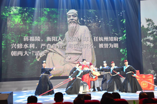 演出在真切感人的《罗帅家书倡廉风》故事讲述中拉开帷幕,古装小戏《蒋福陵智审贪官》,音乐情景剧《日征月迈清长流》,渔鼓小品《两个蒿子粑》,音诗舞《一腔心事托梅花》……演出以周敦颐、彭玉麟、萧石月等12名具有代表性的衡阳籍和曾在衡阳任职的廉洁人物为原型,通过情景剧、话剧、诗朗诵、快板、渔鼓等艺术形式,生动展现廉洁名人的廉洁事迹,颂扬清正廉洁、勤政为民的高尚品格。故事以小见大、发人深省,舞台效果美轮美奂、精彩纷呈,演出现场座无虚席、掌声不断。