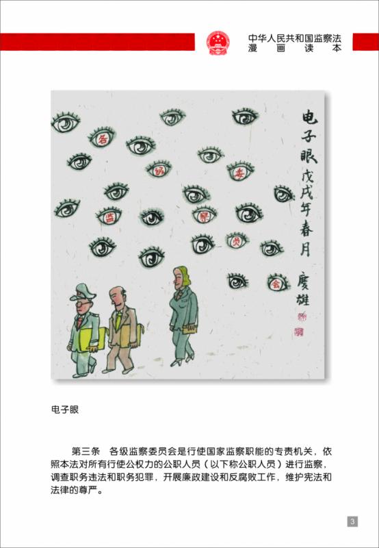 “一只只瞪大的眼睛紧紧盯住三名公职人员,寓意着监察委员会对所有行使公权力的公职人员监督全覆盖.....”近日,湖北省安陆市府城街道儒学社区居民赵辉参观完《监察法》漫画后,对漫画说纪说法的形式赞不绝口。